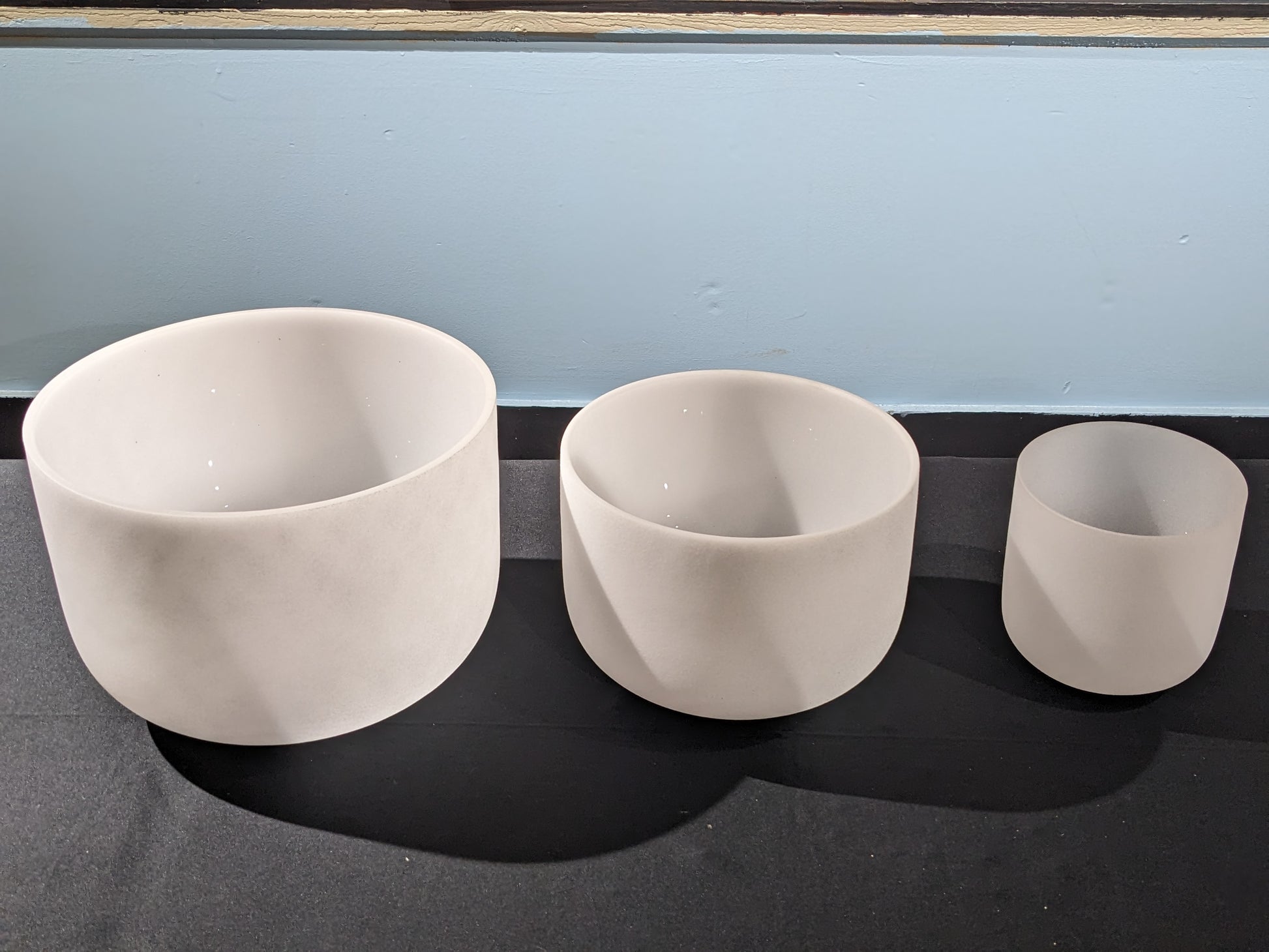 A set of three crystal singing bowls, a must-have for anyone seeking to enhance their meditation or sound therapy practice.