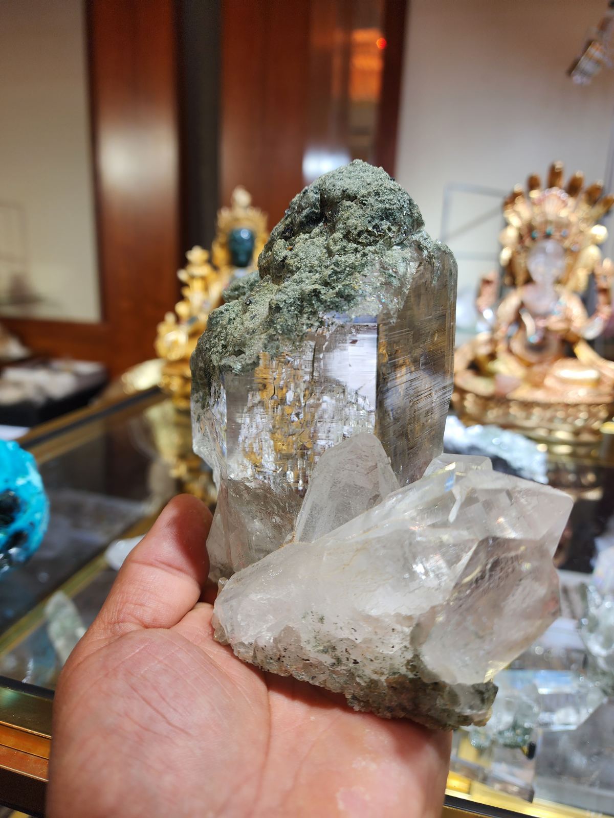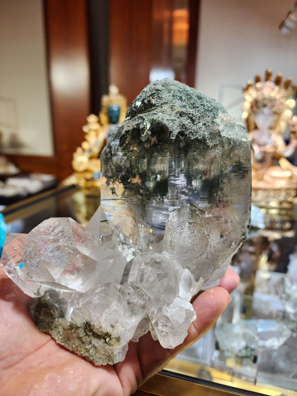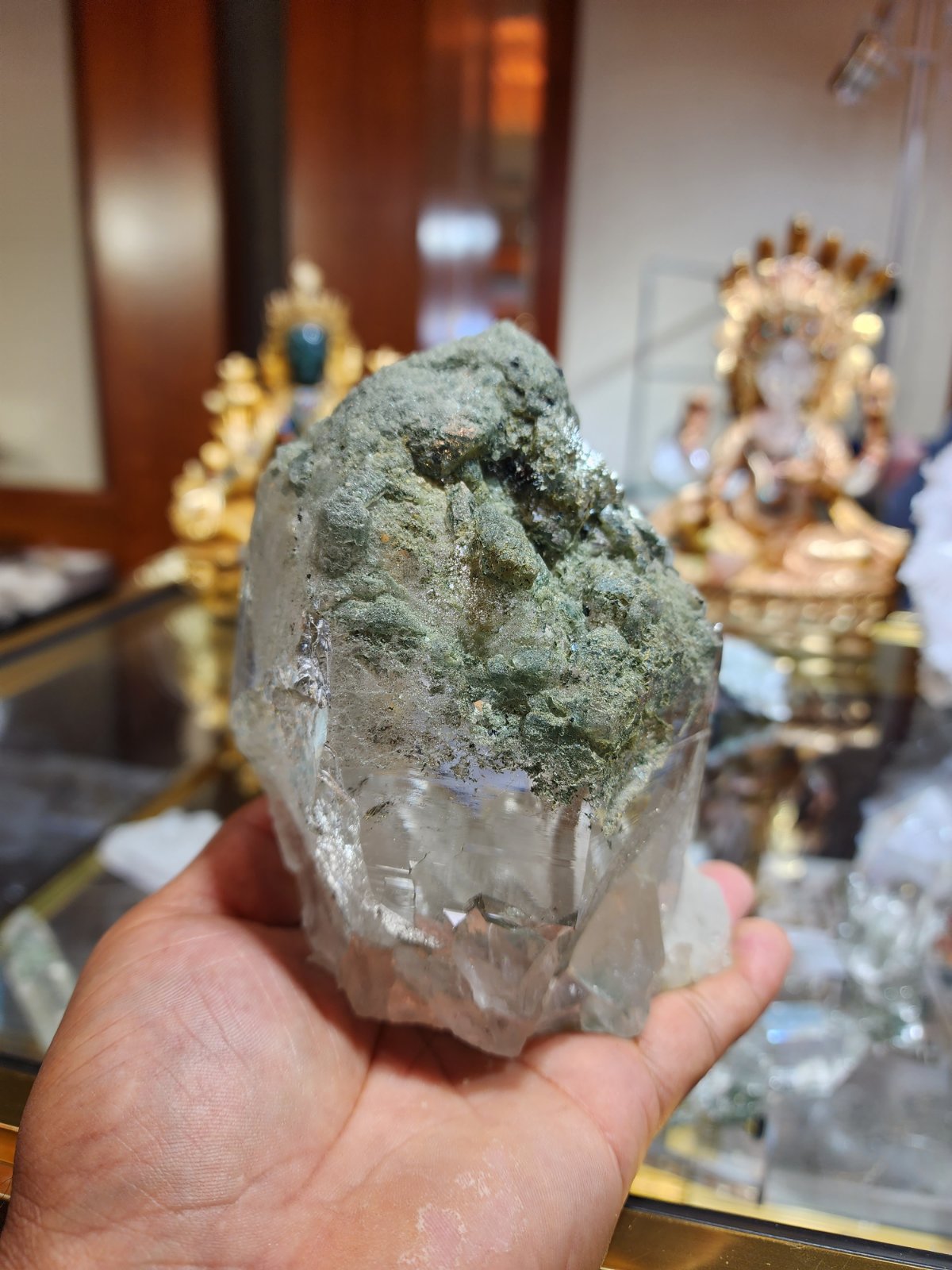 AAA Grade Himalayan Chlorite Quartz. This stone is highly regarded for its healing properties, as the chlorite inclusions are associated with detoxification, emotional cleansing, and grounding. Himalayan Chlorite Quartz is believed to enhance one's connection to nature, promote physical and emotional healing, and stimulate the Heart chakra, fostering love and compassion. Its distinct appearance and metaphysical qualities make it a sought-after crystal for those seeking inner cleansing, balance, and a deeper connection with the natural world.