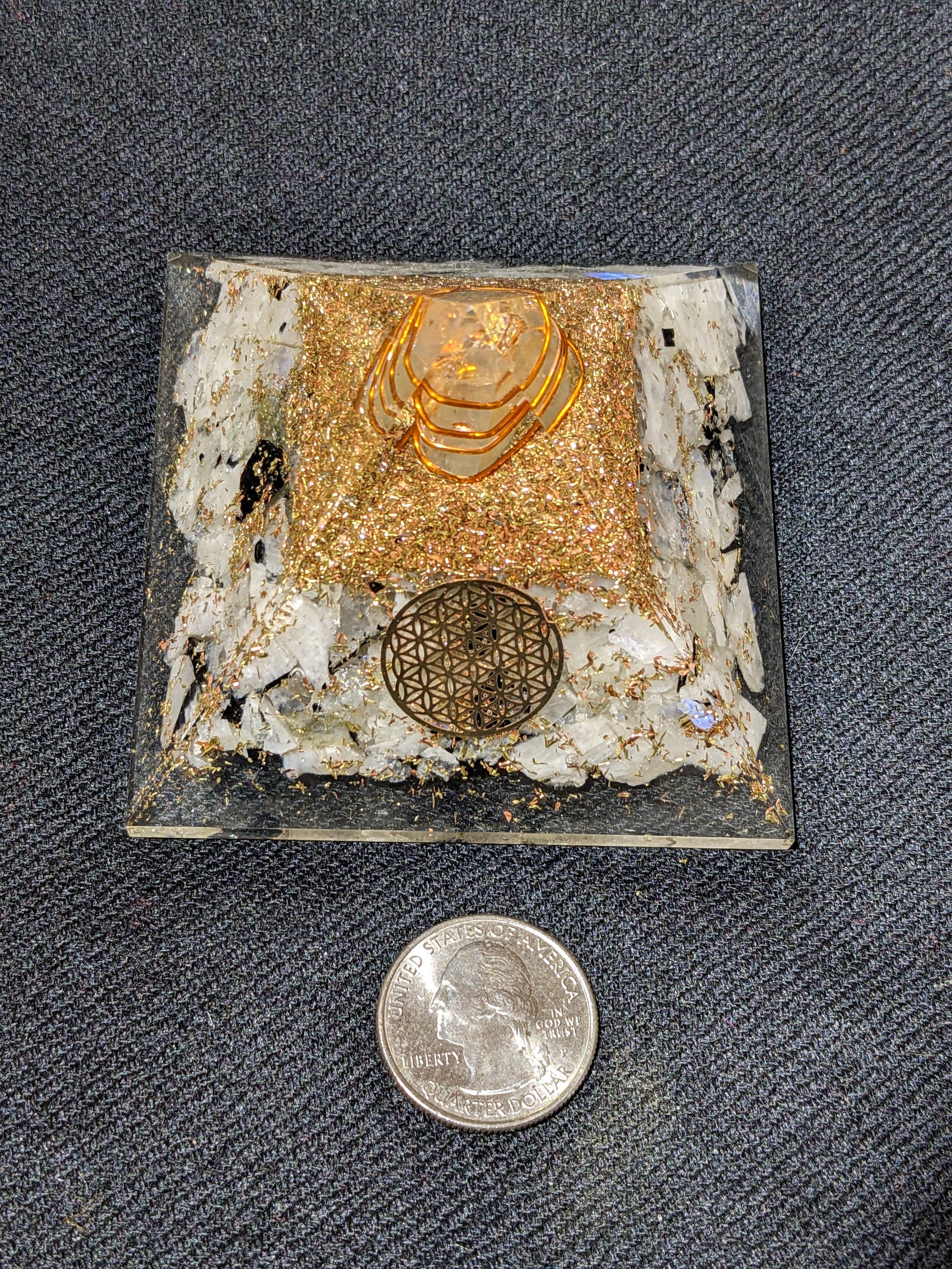 Orgonite pyramid with Rainbow Moonstone and flower of life symbol
